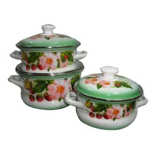 Цвет эмали - белый. Нанесен рисунок на корпусе и на крышке, напыление. Форма с элементом тор. В наборе: кастрюли 1,6; 2,1; 3,0л (крышка металлическая с пластиковой ручкой, на корпусе ручки металлические полые 2шт).