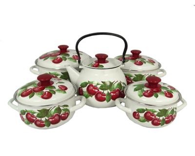 Цвет эмали - белый. Нанесен рисунок на корпусе и на крышке. Форма грушевидная. В наборе: кастрюли 1,5; 2,0; 3,0; 4,0л (крышка металлическая с пластиковой ручкой, на корпусе ручки металлические полые 2шт), чайник 3,0л (с подвижной металлической ручкой, крышка металлическая с пластиковой ручкой).