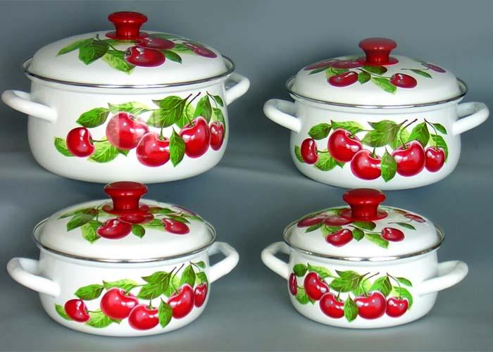 Цвет эмали - белый. Нанесен рисунок на корпусе и на крышке. Форма грушевидная. В наборе: кастрюли 1,5; 2,0; 3,0; 4,0л (крышка металлическая с пластиковой ручкой, на корпусе ручки металлические полые 2шт)