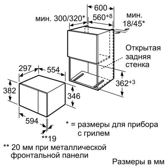 Встраиваемая микроволновая печь высотой 38 см без рамки для бвстрого размораживания, подогрева и приготовления блюд.