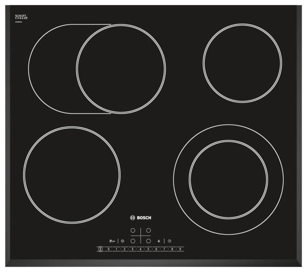 PKN651F17 Bosch – стеклокерамическая варочная панель с независимой системой установки. На панели находятся 4 конфорки быстрого нагрева, одна из которых с радиальной, а другая - с овальной зоной расширения.