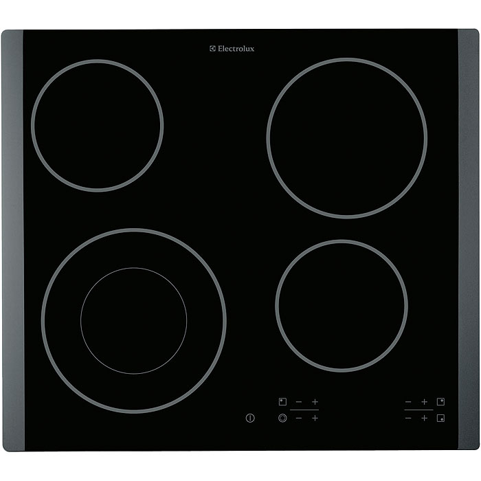 На варочной поверхности Electrolux EHS 60041 P расположены 4 электрические конфорки разного диаметра, причем самая большая из них имеет круглую зону расширения, то есть два контура.