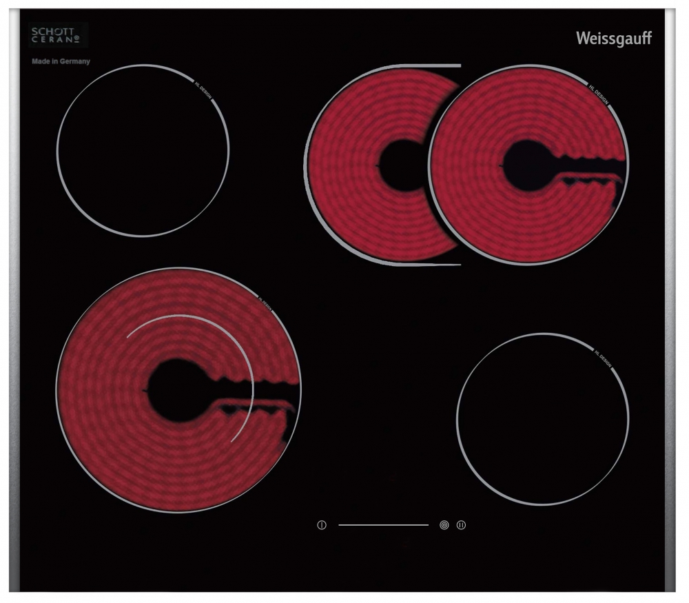 | 4 конфорки, одна с двойной зоной, одна - с расширенной зоной | 1x 210/120 мм*2,2/0,75 Квт, 1х 180*1,8 кВт, 1* 265/170мм*2,4/1,5 кВт, 1х 140 мм*1,2 кВт |