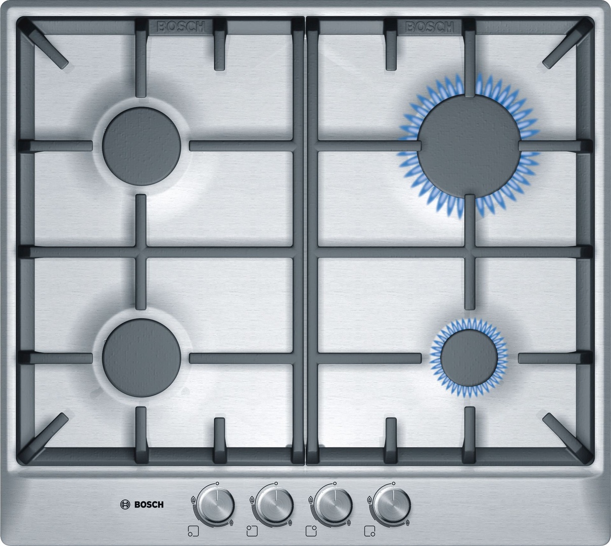 Всего доступно четыре конфорки, которые отличаются друг от друга мощностью. Все они оснащены системой газ-контроля, которая незамедлительно прекратит подачу газа в случае, если огонь по каким-либо причинам погаснет. Панель управления у газовой варочной поверхности Bosch PCP615B90B расположена спереди по центру, благодаря чему эксплуатация агрегата становится максимально комфортной.