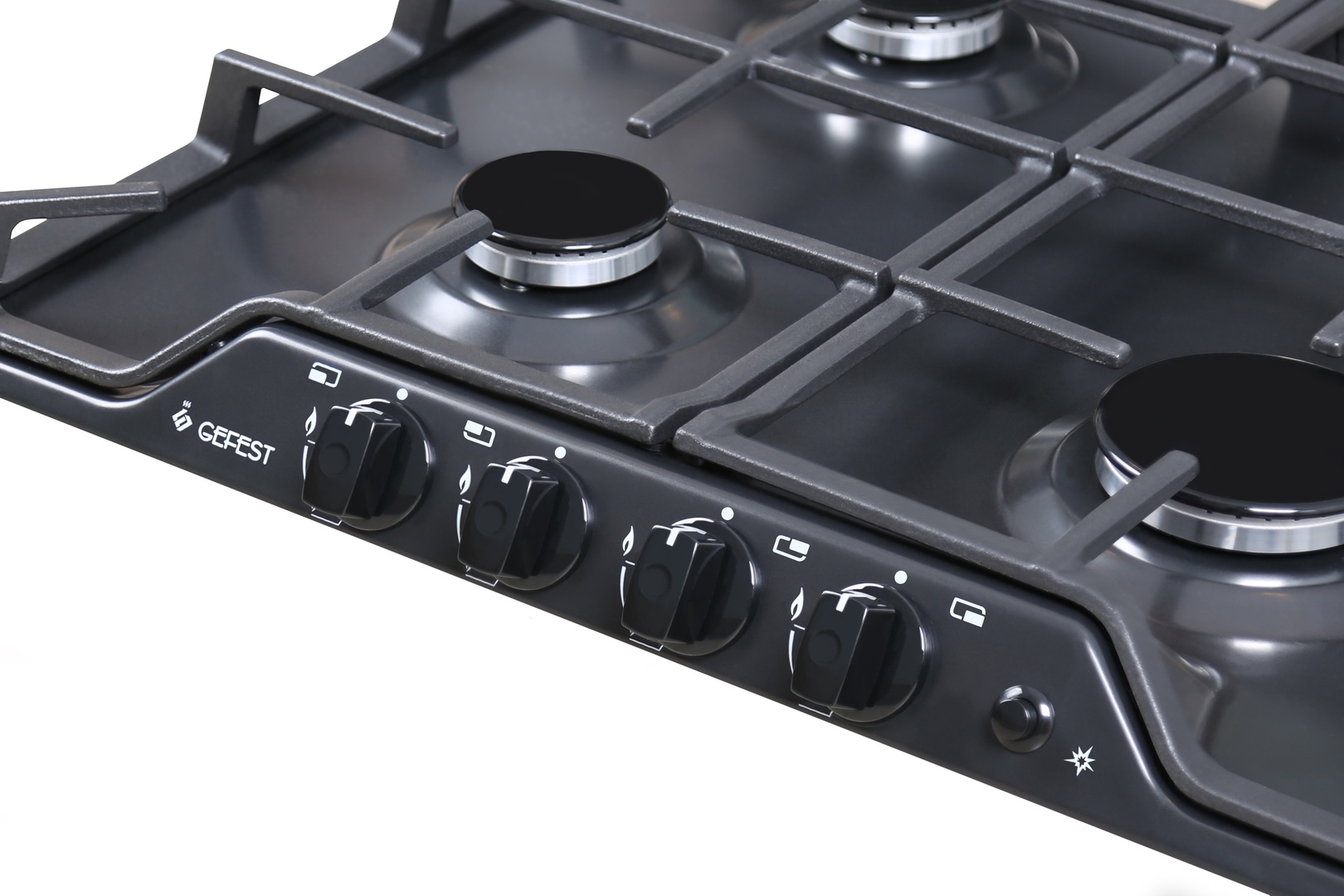 Ширина: 72 см. Глубина: 50 см. Цвет: черный. Материал рабочего стола: газ на стекле. Материал решеток: чугун. Металлические поворотные регуляторы: да. Газ-контроль: есть.