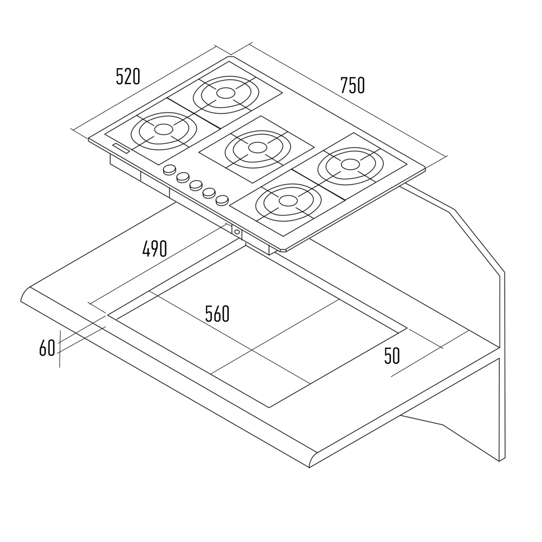 Модель оборудована пятью эффективными конфорками. Центральное положение занимает горелка WOK. Концентрированные ряды пламени воздействую на центр посуды. Время нагрева и приготовления пищи сокращается.