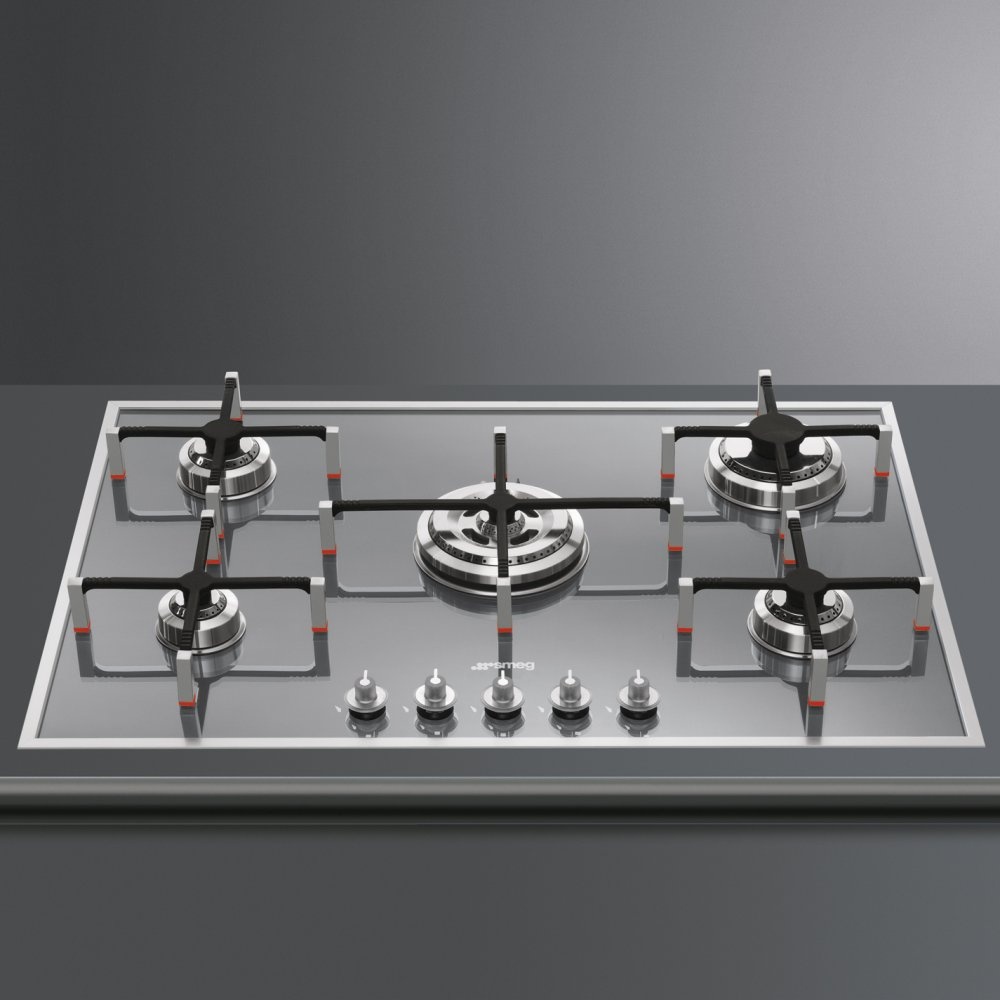 Газовая варочная поверхность Smeg PVS750 выполнена из стекла Stopsol® "Supersilver", которое является очень прочным в эксплуатации. Кнопки их поликарбоната и металла имеют внутреннюю подсветку.