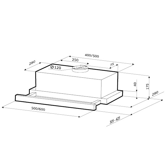 Ширина: 500 мм. Диаметр воздуховода: 120 мм. Рекомендованная площадь кухни: до 8 кв. м. Производительность max: 390 м3/ч. Произв-ть свободный выход: 449 куб. м/ч. Управление.
