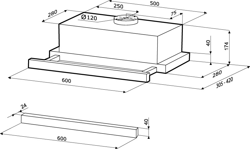 Ширина: 600 мм. Диаметр воздуховода: 120 мм. Рекомендованная площадь кухни: до 11 кв. м. Производительность max: 550 м3/ч. Произв-ть свободный выход: 633 куб. м/ч.